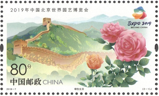 《2019年中國北京世界園藝博覽會》紀念郵票一套2枚,郵票圖案名稱分別為:綠色生活、美麗家園。郵票第一圖畫面以在青山間蜿蜒的長城、北京市市花——月季以及本次世園會的會徽——長城之花為主要元素,寓意園藝源于自然,倡導尊重自然、融入自然的理念,也突出了“中國風格”和“北京品牌”;郵票第二圖畫面以本次世園會國際館、中國館以及吉祥物“小萌芽”“小萌花”為主要元素,整體畫面生機盎然、朝氣蓬勃,啟示人們應當樹立綠色、低碳、環保的生產生活理念。