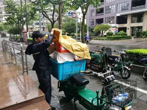 上海:臺風(fēng)天氣,上海市1.1萬名“郵政小哥”一如既往堅守投遞一線,不負(fù)客戶所托,確保百姓用郵。李璐瑤 攝