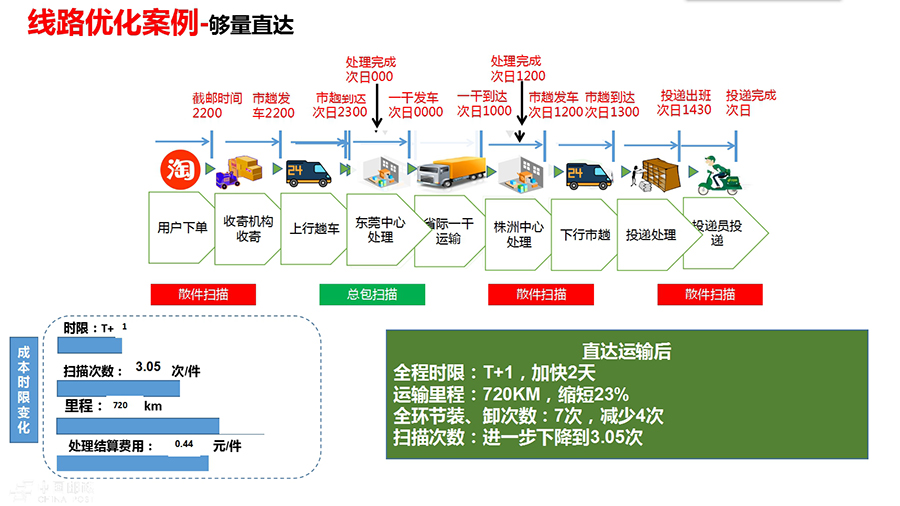 郵路要怎么捋?就是要以和競爭對(duì)手對(duì)標(biāo)為任務(wù),對(duì)每條線路從收寄到投遞進(jìn)行全環(huán)節(jié)梳理、全鏈路優(yōu)化。以廣東東莞—湖南株洲線路為例:這條線路目前日均包件量1000件,在全散件模式下,由于沒有直達(dá)郵路,郵件從收寄到投遞,每個(gè)郵件全程需經(jīng)過6次散件分揀,11次散件裝卸搬運(yùn),時(shí)限T+3。通過全環(huán)節(jié)捋、全流程捋、各環(huán)節(jié)優(yōu)化,改為在東莞實(shí)施前置集包,散件在收寄網(wǎng)點(diǎn)直接分揀封入株洲總包,同時(shí)開通東莞—株洲直達(dá)郵路,郵件由原來在東莞—廣州—長沙—株洲間散件裝卸,優(yōu)化為東莞—株洲總包裝卸。通過這兩種優(yōu)化措施的結(jié)合,郵件由散件分揀6次、裝卸搬運(yùn)11次,將變?yōu)樯⒓謷?次、總包分撥3次、裝卸搬運(yùn)7次,減少了廣州和長沙的4次總包裝卸作業(yè),處理結(jié)算費(fèi)用降低39%,裝卸效率大幅提升;時(shí)限水平由T+3將減少為T+1,達(dá)到次日遞,超過主要競爭對(duì)手;全程運(yùn)輸里程從936公里將縮短為720公里,減少了23%,節(jié)約了運(yùn)輸成本。此外,在該線路日均郵件量較少的情況下,可以采取組開深圳—東莞—株洲串行直達(dá)的運(yùn)輸方式,在提高車輛裝載率的同時(shí),實(shí)現(xiàn)當(dāng)天收寄的東莞—株洲郵件和18點(diǎn)前收寄的深圳—株洲郵件全程時(shí)限T+1。