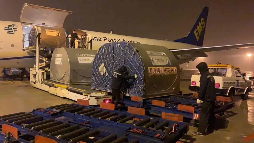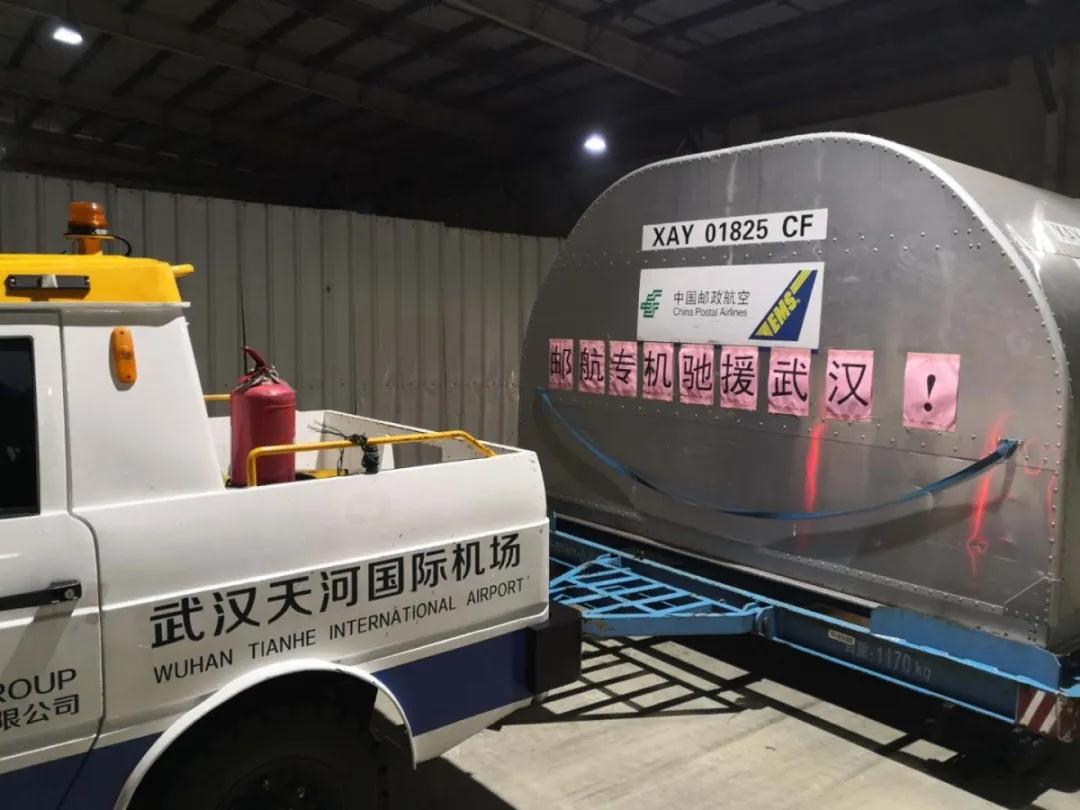 2月27日17時32分,中國郵政航空公司CF9121航班承載著總重1.618噸的16臺德國產(chǎn)ECMO設(shè)備及配套耗材從北京首都機(jī)場起飛,于19時16分在小雨中飛抵武漢天河機(jī)場,郵航武漢辦事處和天河機(jī)場地面保障部門第一時間展開卸機(jī)作業(yè),完成這批救命設(shè)備的空陸交接。