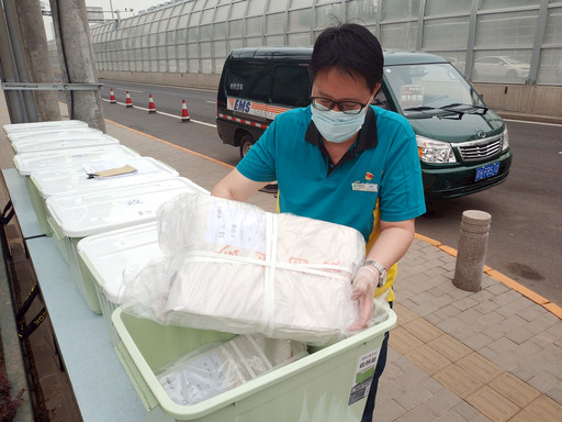 今年全國(guó)兩會(huì)期間,按照兩會(huì)總務(wù)組提出的“全封閉、無接觸”原則,北京郵政采取“定點(diǎn)無接觸式投遞”方式配送報(bào)刊、信件等郵件,并使用專用箱對(duì)兩會(huì)郵件進(jìn)行統(tǒng)一消毒,確保兩會(huì)郵政服務(wù)與疫情防控工作萬無一失。圖為北京郵政工作人員在代表、委員駐地外對(duì)兩會(huì)用報(bào)進(jìn)行核對(duì)(核對(duì)無誤后由代表、委員駐地相關(guān)工作人員接收)。 □記者 楊光 攝影報(bào)道