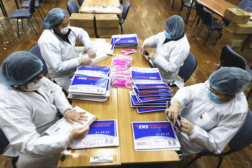 自2月13日起,青島政府網(wǎng)推出“網(wǎng)上預(yù)約、郵政配送”方式,面向廣大市民投放民用口罩。青島市郵政分公司接到任務(wù)后,制定了詳細(xì)的運(yùn)行組織與服務(wù)方案,工作人員“全副武裝”,嚴(yán)格按照防疫要求處理口罩郵件。□崔鵬森 攝