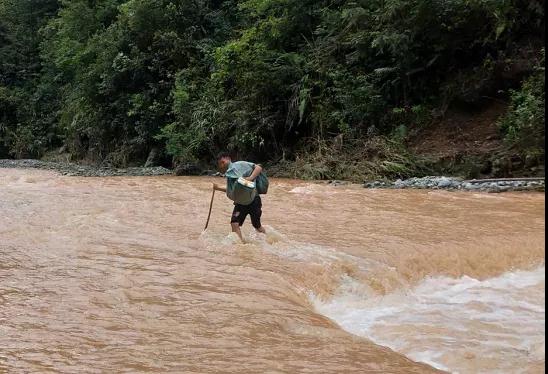 6月11日一早,潘志貴整理好郵件后出發了。當他來到距離友娘村5公里的小河邊時,被洪水擋住了前進的道路,由于水勢過大,車輛沒法通過,于是他停下摩托車,到附近山上找來一根木棍,把郵包挎在自己的肩膀上,一邊手撐木棍一邊在河中試探著移步,之后繼續徒步走向友娘村。