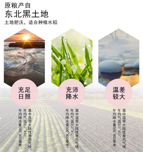 長白山源頭水灌溉,是世界三大最優質礦泉水源地之一。而地處北緯41-46°吉林擁有肥沃的黑土地,是世界唯一“黃金水稻生產帶”。日照充足、水源優質、肥沃黑土、氣侯適宜孕育出中國最為優質的吉林大米,從此走向世界。