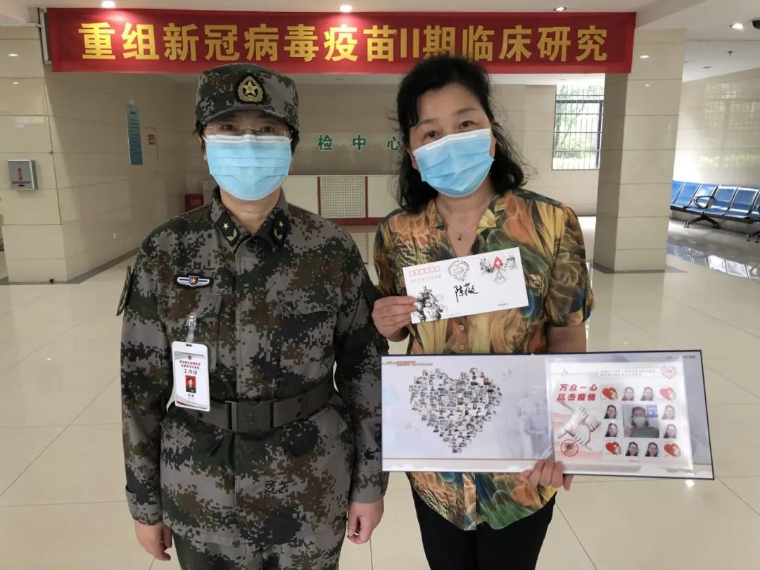 在為期6個(gè)月的觀察期里,胡巧云經(jīng)歷了多次定期“回訪檢查”,身體狀況一直健康良好,其間沒有出現(xiàn)任何不適。胡巧云在9月27日又做出人生的“重大決定”,再次接種疫苗。這次她參與的是重組新冠疫苗(腺狀病毒載體)I期加強(qiáng)免疫臨床試驗(yàn),試驗(yàn)觀察期為一年。9月28日,胡巧云接受了本輪觀察期的首次抽血檢查,檢查中,她又見到了熟悉的陳薇院士,遞上專程帶來的郵資紀(jì)念封請她簽名并合影留念。