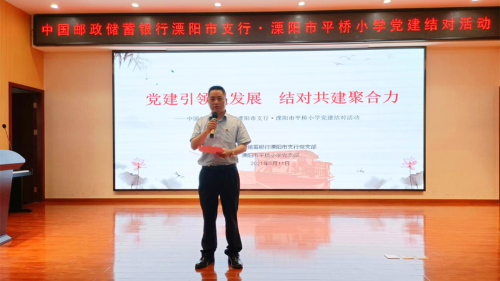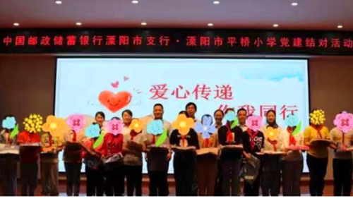 為進(jìn)一步加強(qiáng)黨支部建設(shè),引導(dǎo)和激勵(lì)廣大黨員干部“不忘初心、牢記使命”,郵儲(chǔ)銀行溧陽(yáng)市支行黨支部、溧陽(yáng)市平橋小學(xué)黨支部于5月11日上午在平橋小學(xué)報(bào)告廳開(kāi)展了結(jié)對(duì)共建活動(dòng)。這是該行自2016年與平橋小學(xué)簽訂結(jié)對(duì)共建協(xié)議以來(lái),連續(xù)第6年組織黨員代表、“紅鈴鐺”課堂志愿者走進(jìn)學(xué)校開(kāi)展共建活動(dòng)。
