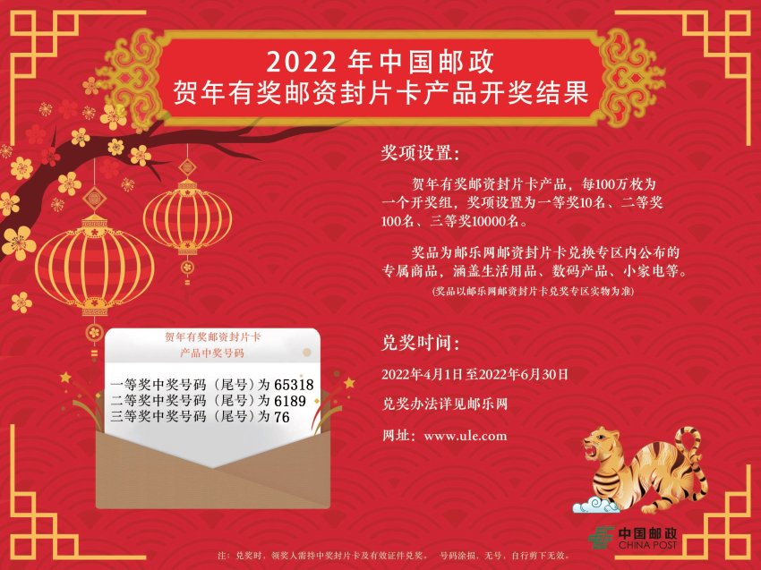 2022年賀年有獎(jiǎng)郵資封片卡中獎(jiǎng)號(hào)碼于3月18日產(chǎn)生。現(xiàn)將中獎(jiǎng)信息通知如下: