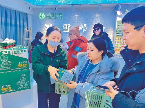 與常規(guī)的明信片不同,該活動推出的6萬張杯套明信片設(shè)計成帶狀,兩端有卡槽,方便套在杯子上,既美觀又實用。明信片上的景點一共7個,成為外地游客快速尋找哈爾濱重點打卡地的“指示牌”。同時,哈爾濱郵政開設(shè)的冰雪大世界主題郵局和充滿俄式風(fēng)情的中央大街主題郵局,也成為游客的熱門打卡地。兩家主題郵局引進風(fēng)光明信片、特色紀念郵戳、冰箱貼、音樂盒、托特包等500余款文創(chuàng)產(chǎn)品,充分滿足各地游客購買旅游紀念品的需求,每天都要營業(yè)到深夜。