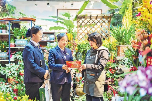 郵儲(chǔ)銀行福建省莆田市分行工作人員向鮮花商戶推介金融產(chǎn)品,根據(jù)商戶的生產(chǎn)經(jīng)營情況,為他們制定個(gè)性化融資服務(wù)方案。□黃益強(qiáng) 攝