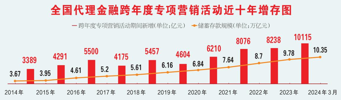 目前,全國郵政代理金融(2023—2024)跨年度專項營銷活動已圓滿結(jié)束,各級機構(gòu)內(nèi)外兼修強服務、客戶至上增價值、拓客增存增收,取得了顯著成效。活動期間,儲蓄存款新增10115億元,其中,價值存款新增10254億元,價值存款新增占比為101.4%;代發(fā)單位新增25448戶,代發(fā)金額達4072億元。截至2024年3月末,全國郵政代理金融儲蓄存款規(guī)模達103529億元。跨年度專項營銷活動成為全國郵政代理金融儲蓄存款高位爬坡的“主引擎”,近10次跨年度專項營銷活動累計新增儲蓄存款59234億元,今年2月,儲蓄存款規(guī)模邁上10萬億元歷史性新臺階。