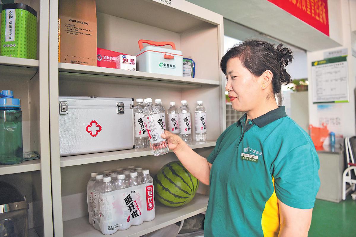 6月以來,河南省氣象臺連續(xù)發(fā)布多個高溫紅色預(yù)警。為應(yīng)對極端高溫天氣、保障企業(yè)安全穩(wěn)定運行,河南省郵政分公司要求所轄各級郵政企業(yè)加強對員工的關(guān)心關(guān)愛,做好一線生產(chǎn)人員的健康監(jiān)測,尤其是對攬投、分揀等一線生產(chǎn)人員,適當調(diào)整作業(yè)時間,備齊防暑藥品及防暑飲品,聯(lián)合工會積極開展“夏日送清涼”等慰問活動,確保員工身體健康與生產(chǎn)安全。圖為鄭州市鄭東新區(qū)郵政分公司常寨攬投部為攬投員配備了防暑物品和藥品等。
