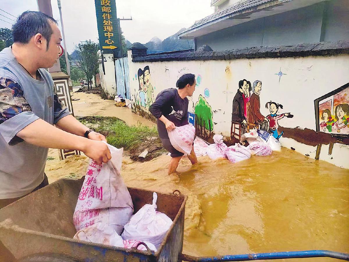 在貴州省黔東南苗族侗族自治州,山洪沖擊鎮(zhèn)遠(yuǎn)縣郵件處理中心,郵政員工用沙袋堵洪引流,緩解水患?! 踔苌忻鳌z