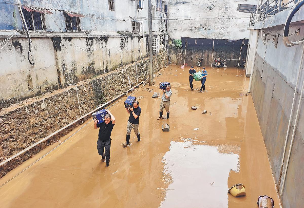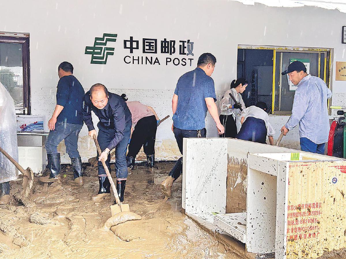 6月26日,安徽省黃山市歙縣郵政分公司第一時間組織12人的先鋒隊趕往紹濂郵政所除淤、清理雜物,開展災(zāi)后恢復(fù)生產(chǎn)經(jīng)營工作。 □王艷琪 攝