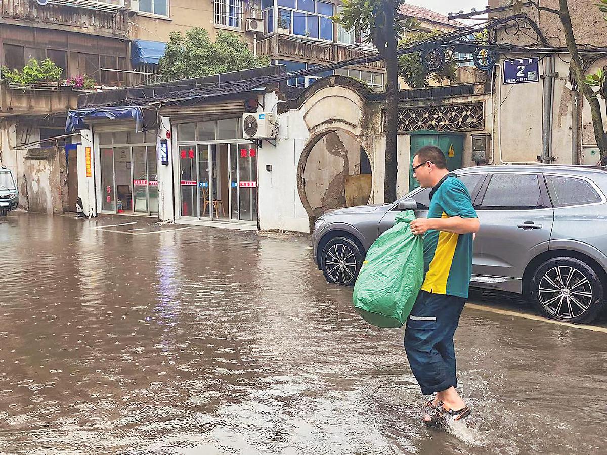 江蘇省蘇州市太倉縣郵政分公司投遞員冒雨蹚水投遞郵件。 □徐玉亭 攝