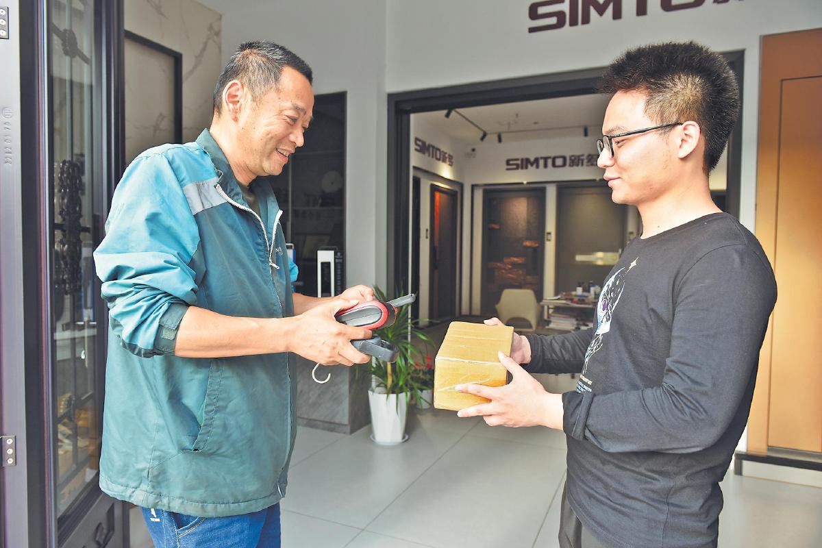 江蘇省南通市海門(mén)區(qū)郵政分公司員工上門(mén)為客戶提供退換貨寄遞服務(wù)。 □王歡 攝