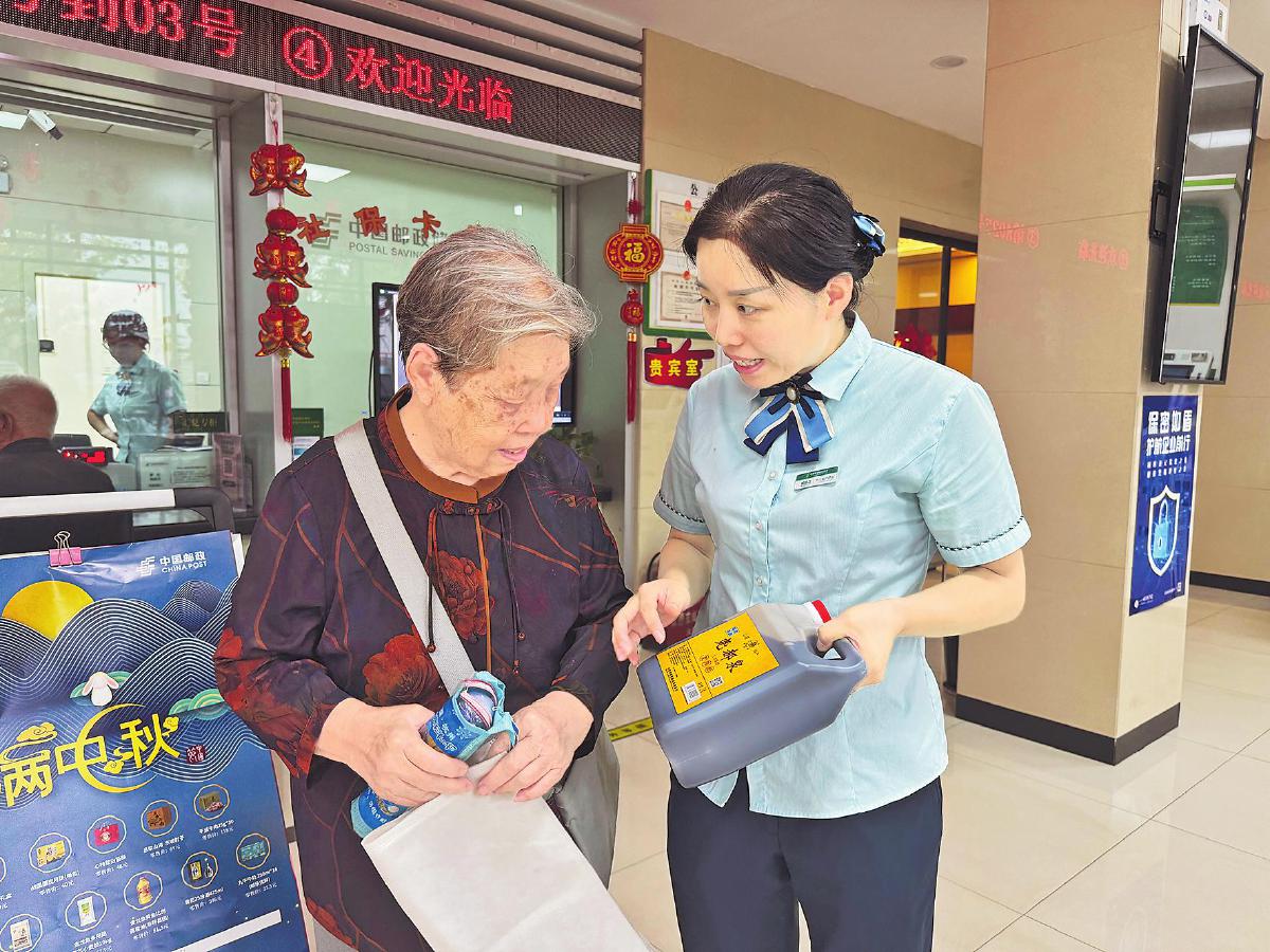 “月滿中秋”活動中,郵政網(wǎng)點員工向客戶推介陳醋產(chǎn)品。