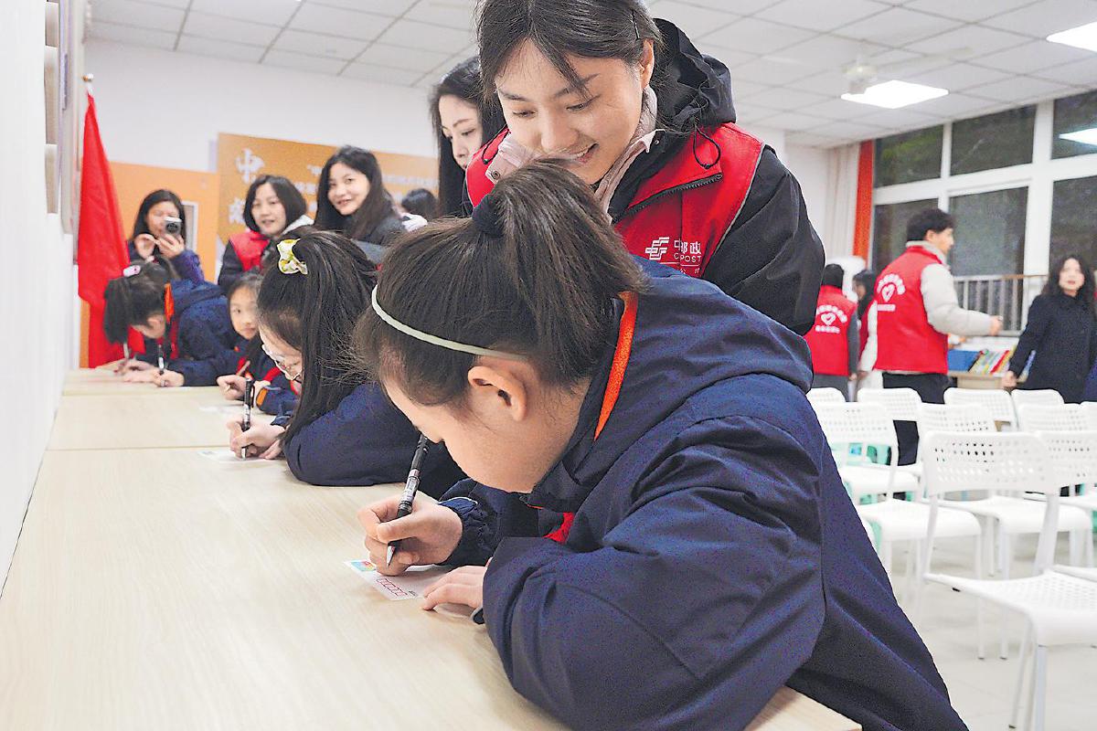 少年郵局內,重慶郵政青年志愿者指導小朋友書寫明信片。